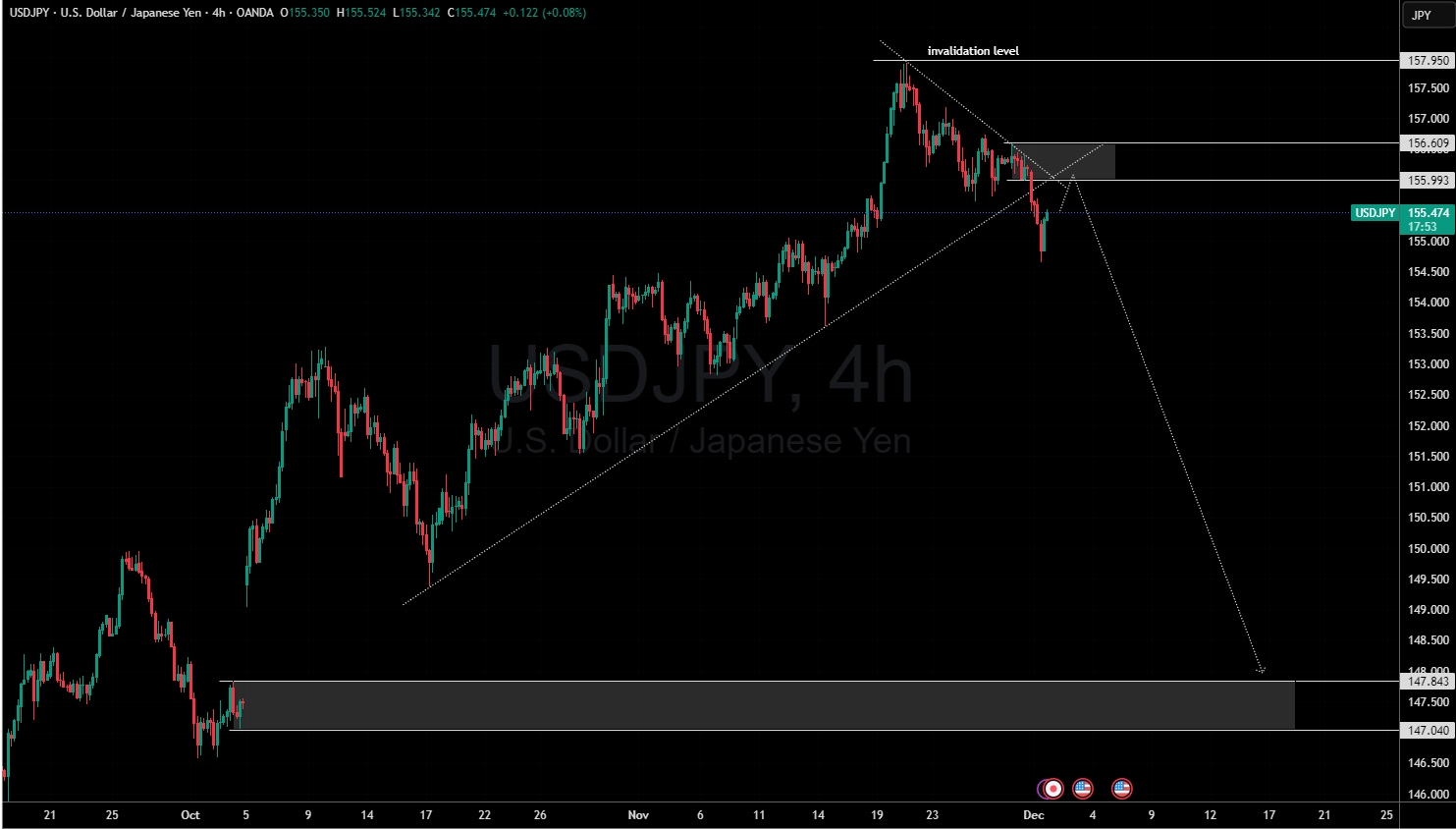 USDJPY on the 4H chart has broken below its medium-term ascending trendline, signaling a structural shift and increasing downside risk. Price is now retesting the 156.00–156.60 pullback resistance zone, where sellers may attempt to regain control.